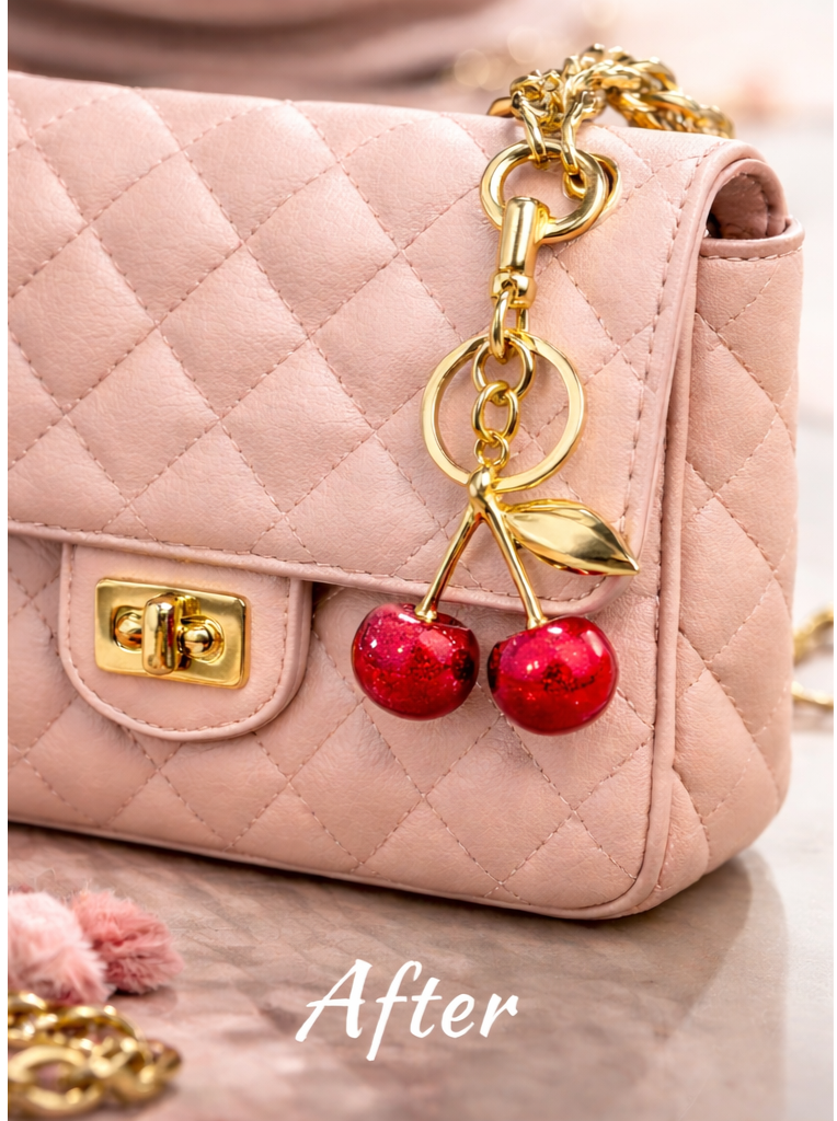 Elevate your style with this charming cherry bag keychain, designed to add a playful yet elegant touch to any handbag or purse while making a delightful gift for women and girls.