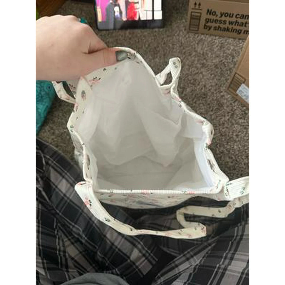 Answer 1: This tote is made from soft, durable corduroy with a cotton lining, finished with sturdy webbing straps for everyday use.